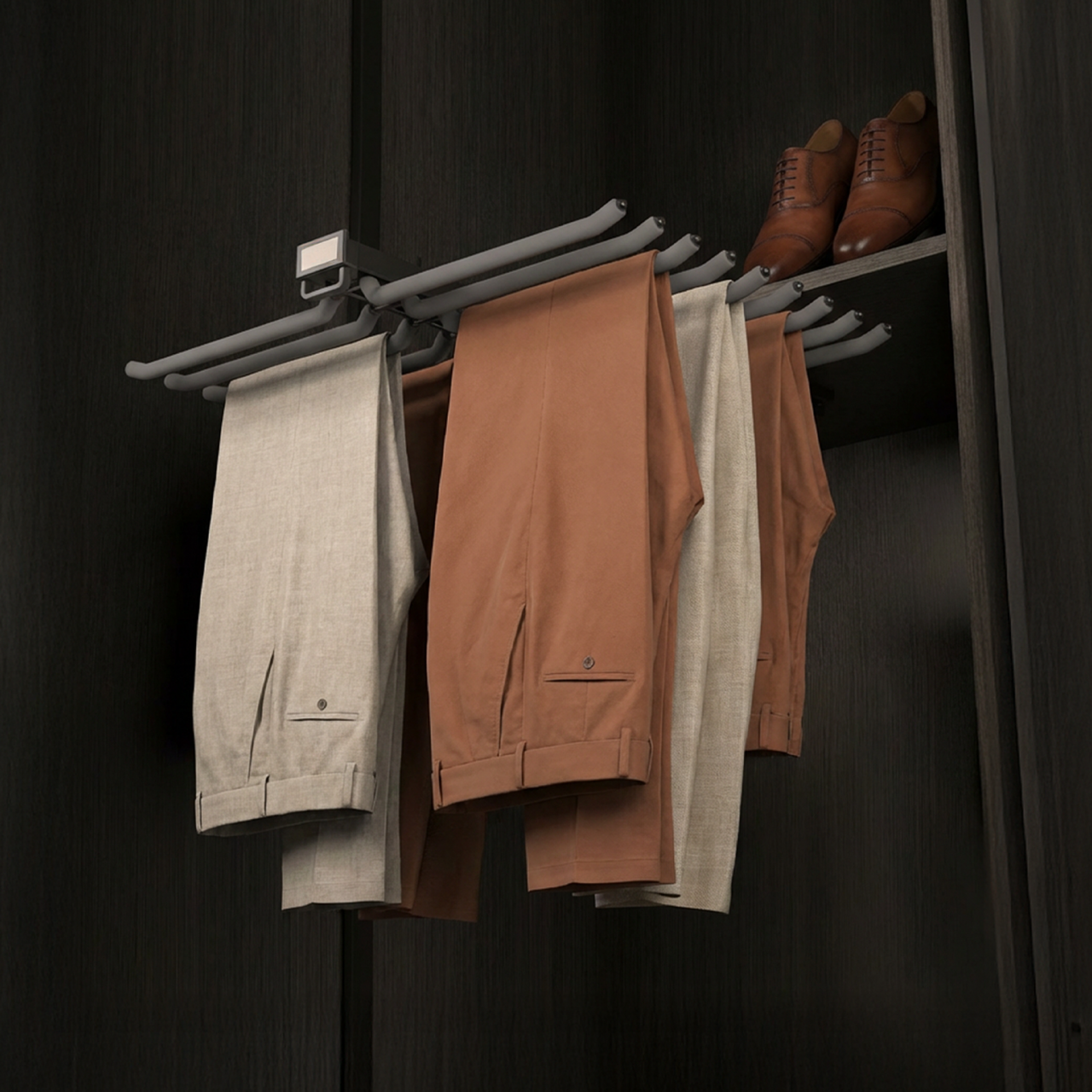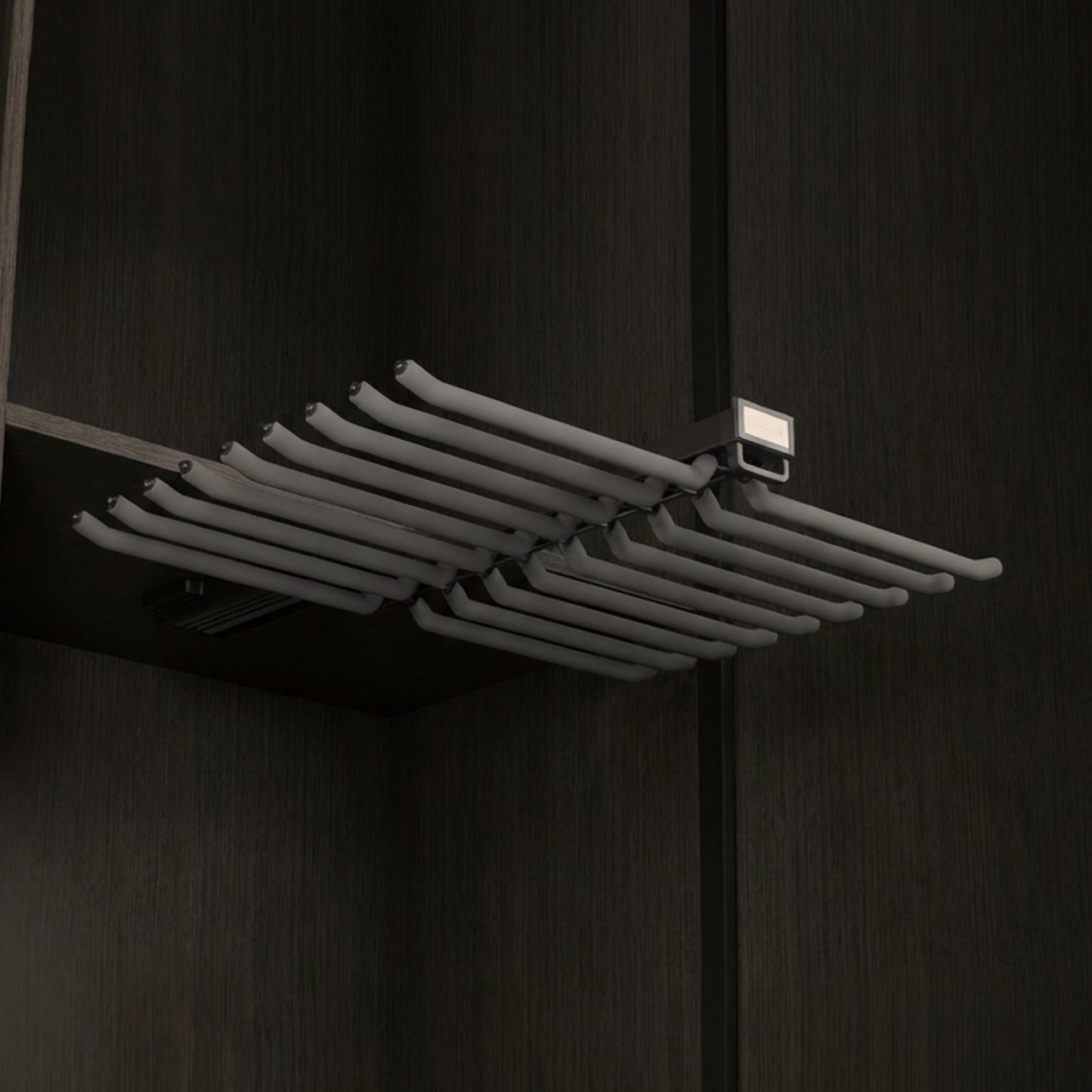 O Calceiro Duplo Klosi para armários ou closet de quarto é um acessório premium concebido para garantir organização eficiente, com elegância e acesso prático às peças de vestuário. Integrado na gama Klosi, este calceiro apresenta um design moderno e elegante, com um modelo contemporâneo que combina na perfeição com os restantes acessórios da coleção Klosi. Equipado com 18 braços (9 de cada lado), o Calceiro Klosi oferece elevada capacidade de arrumação, ideal para manter as calças bem distribuídas, visíveis e protegidas. O sistema deslizante de extensão total, aliado ao fecho suave, assegura conforto, segurança e durabilidade na utilização diária. Desenvolvido para armários e closets, o Calceiro Duplo Klosi valoriza o interior do espaço e reflete um elevado padrão de qualidade, característico da linha Klosi, uma gama exclusiva Febol.