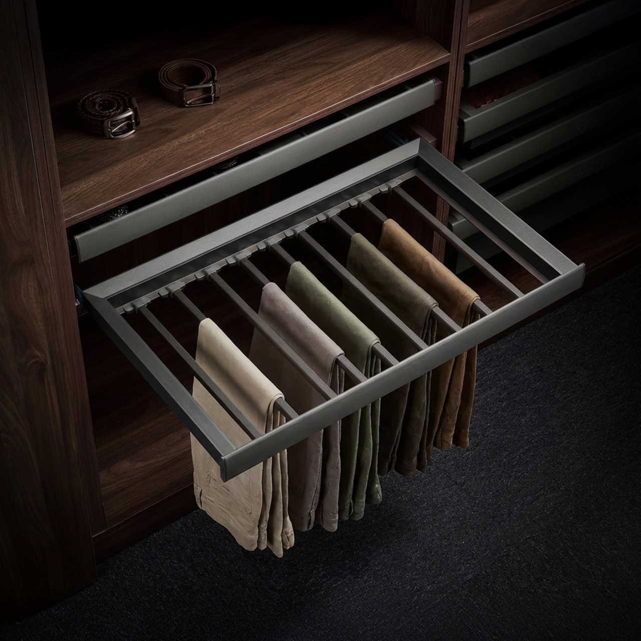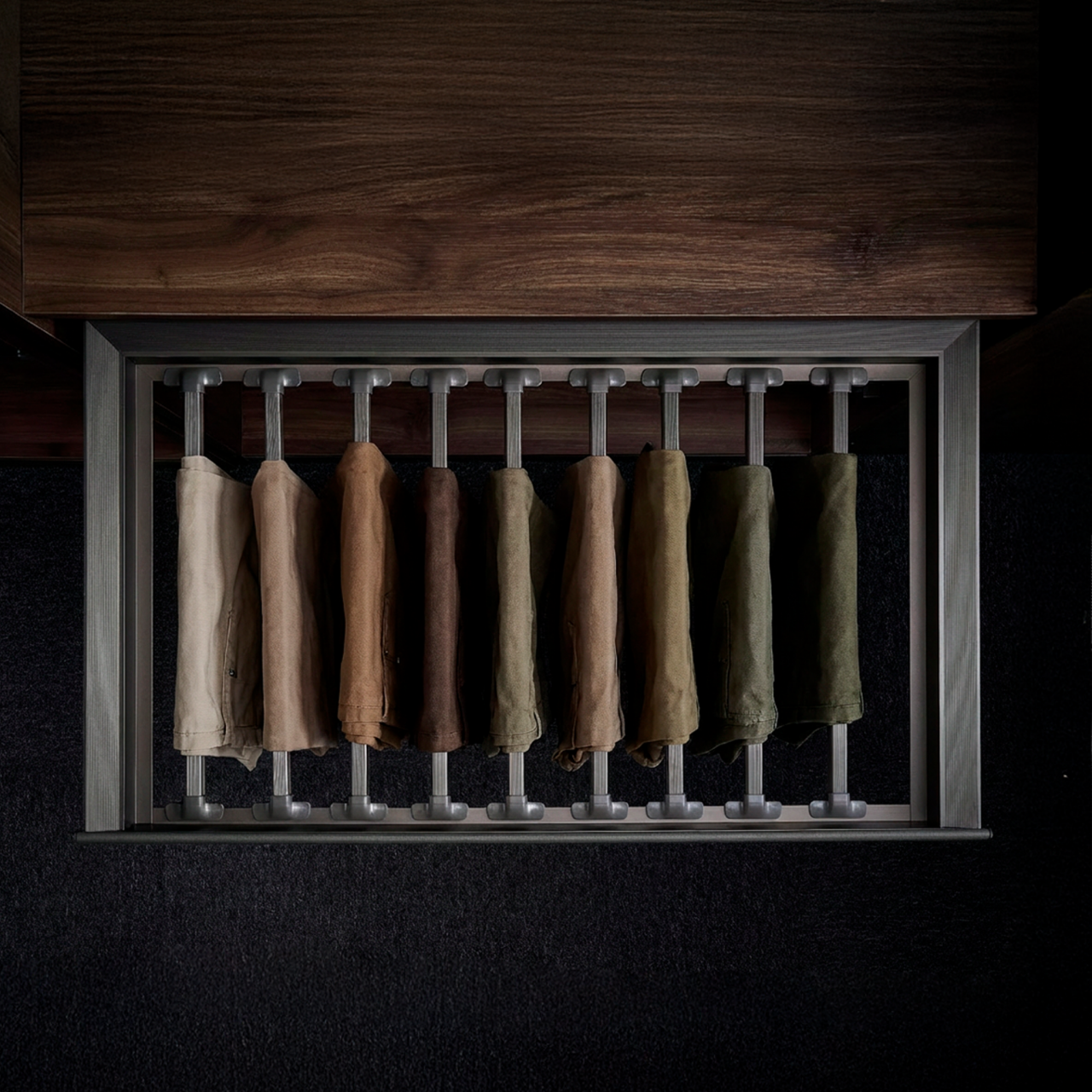 A Gaveta Calceiro Klosi para armários ou closet de quarto é um acessório concebido para assegurar organização, elegância e funcionalidade no interior do armário. Integrado na linha exclusiva Klosi, apresenta um design moderno e elegante, aliado a um modelo contemporâneo que valoriza o espaço e facilita o acesso às peças de vestuário. Fabricado com materiais de elevada qualidade, o Calceiro Klosi dispõe de um sofisticado acabamento em couro, combinado com tubos metálicos antiderrapantes na cor antracite, garantindo resistência, estabilidade e proteção das calças. Equipado com corrediças com amortecedor, este acessório oferece um fecho suave e silencioso, proporcionando conforto e durabilidade na utilização diária. O modo de instalação rápido permite reduzir o tempo e as etapas de montagem, assegurando uma integração simples nos armários Klosi. O Calceiro Klosi é a solução ideal para quem procura organização eficiente no closet ou armário de quarto.
