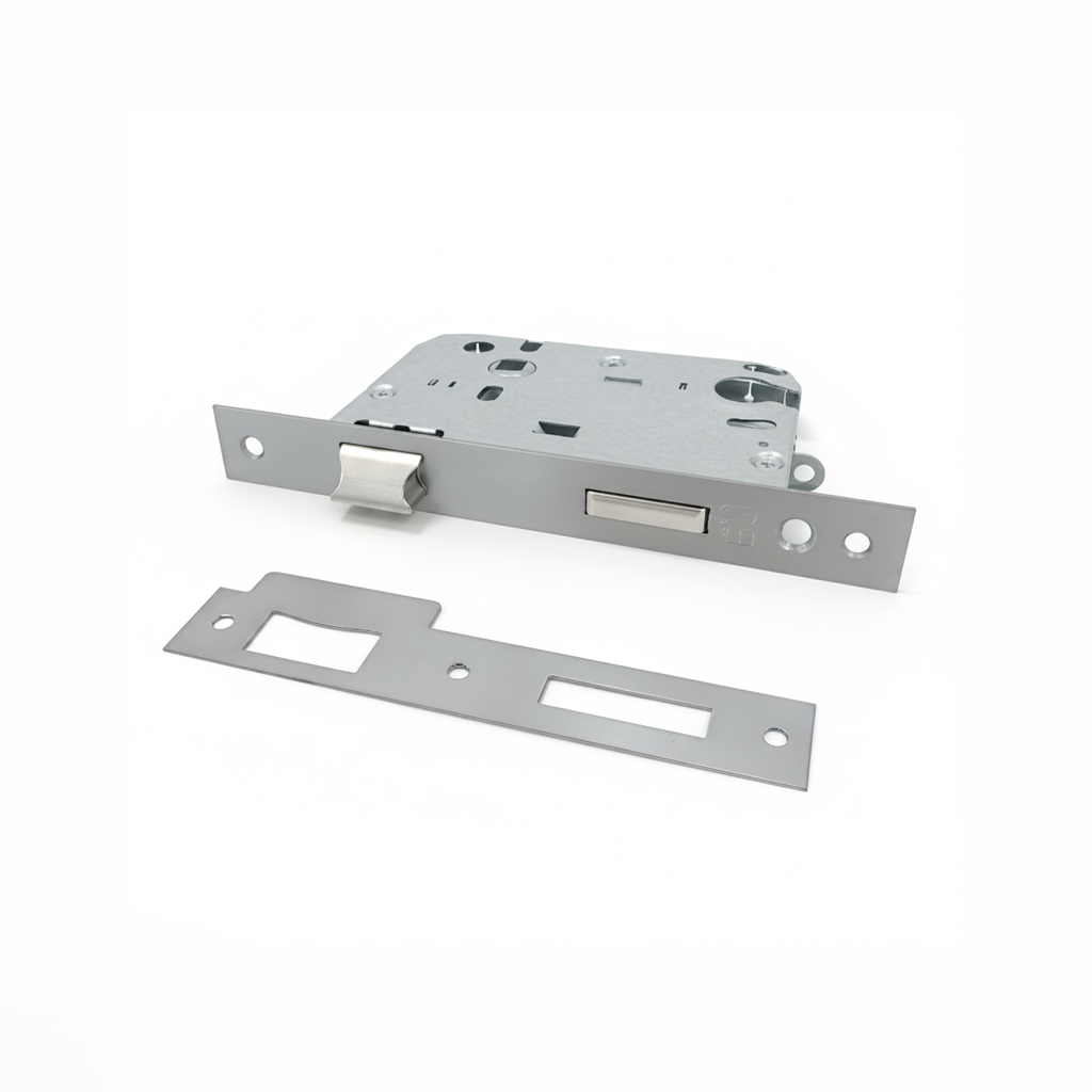A fechadura 725E é uma solução robusta e funcional para aplicação em portas interiores, ideal para projetos que exigem segurança, durabilidade e um acabamento moderno em inox. Trata-se de uma fechadura de embutir com testa reta, concebida para uma instalação discreta e alinhada com a porta, garantindo um visual limpo e contemporâneo. O seu sistema inclui trinco reversível, permitindo adaptação a portas de abertura direita ou esquerda, aumentando a versatilidade de aplicação. Fabricada com frente em aço inoxidável, oferece elevada resistência à corrosão e ao desgaste, sendo adequada para uso contínuo em ambientes residenciais ou comerciais. Pode ser utilizada com cilindro de perfil europeu, assegurando um sistema de fecho eficiente e seguro.