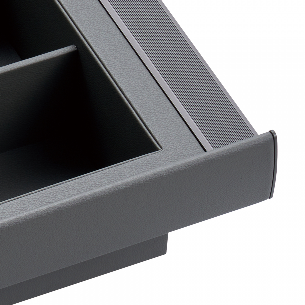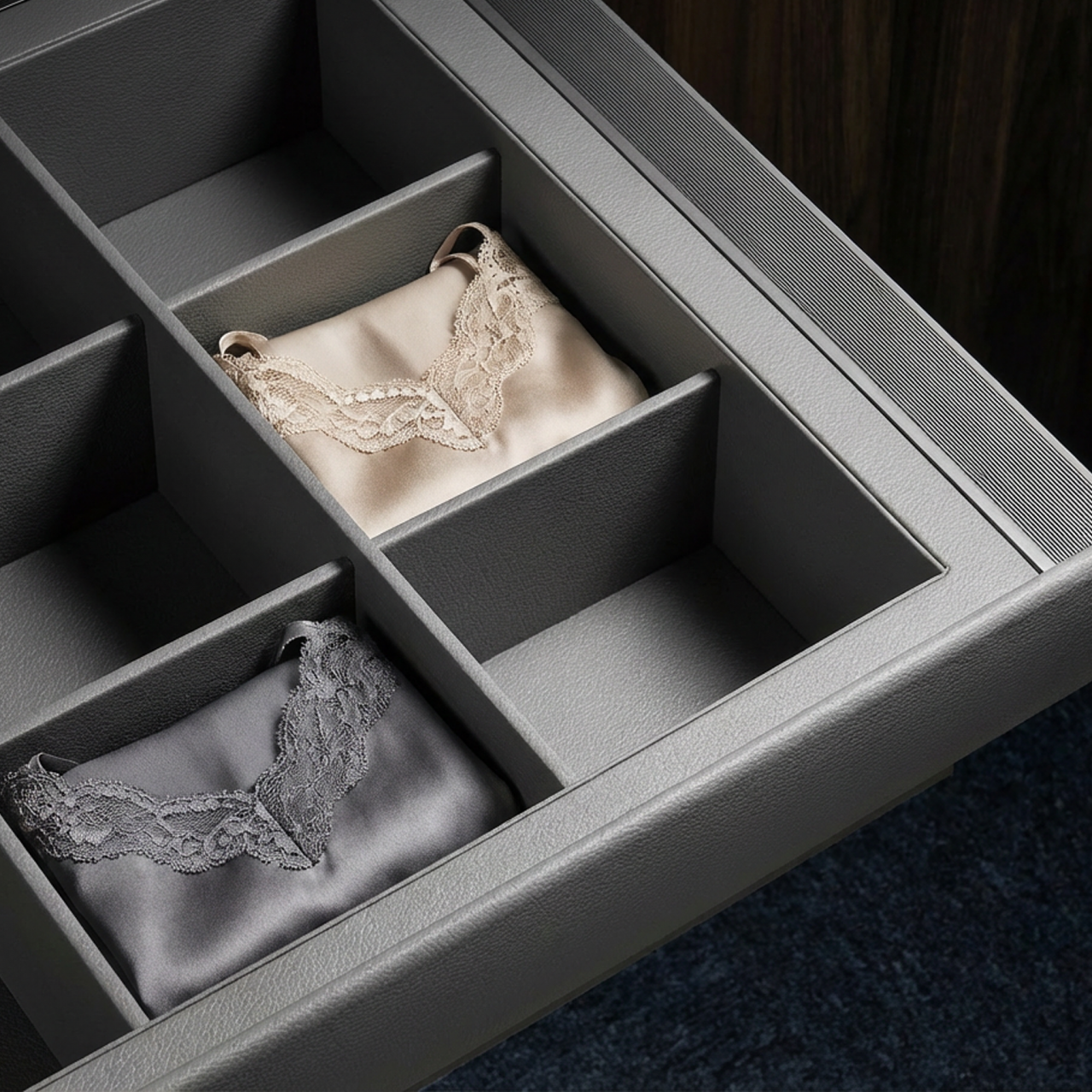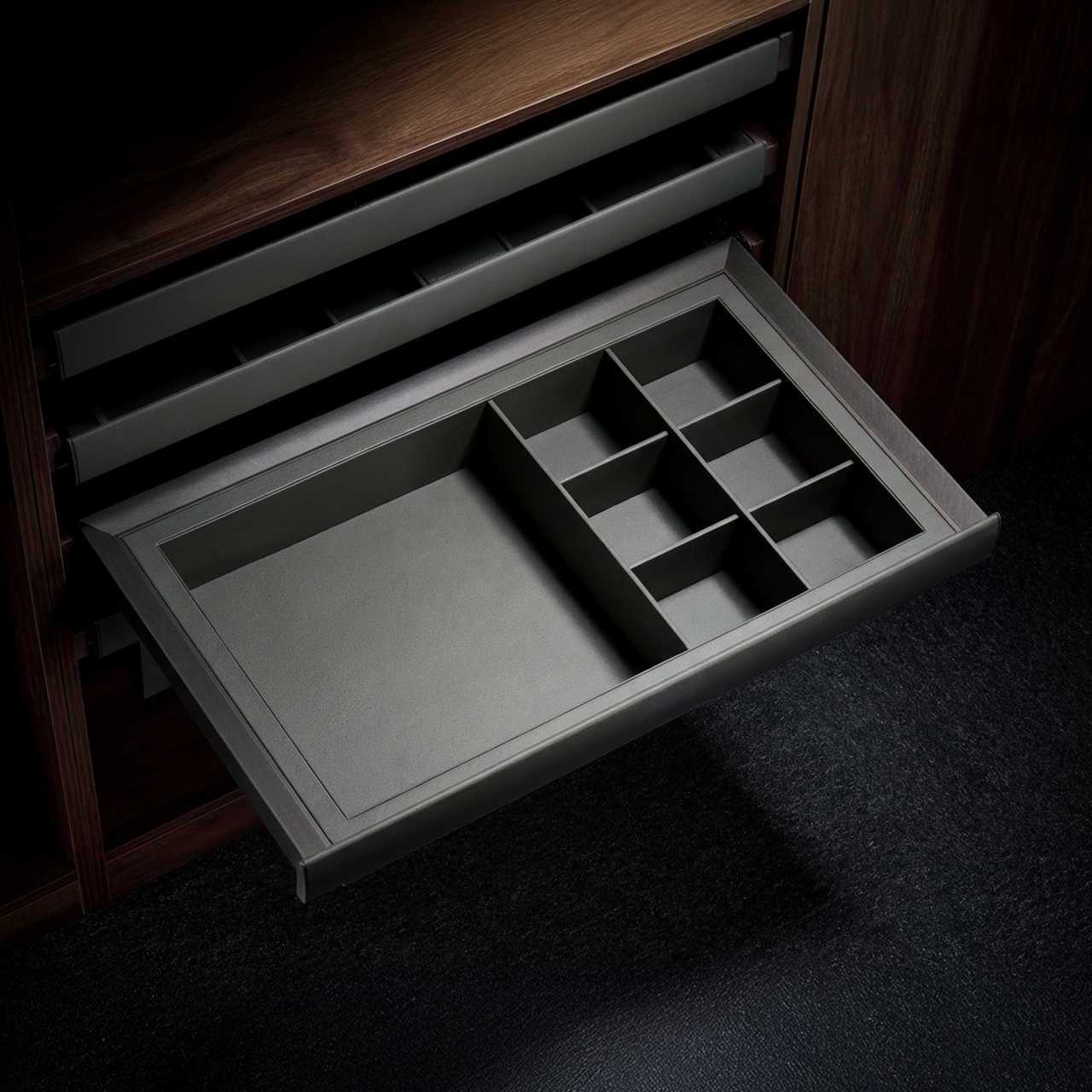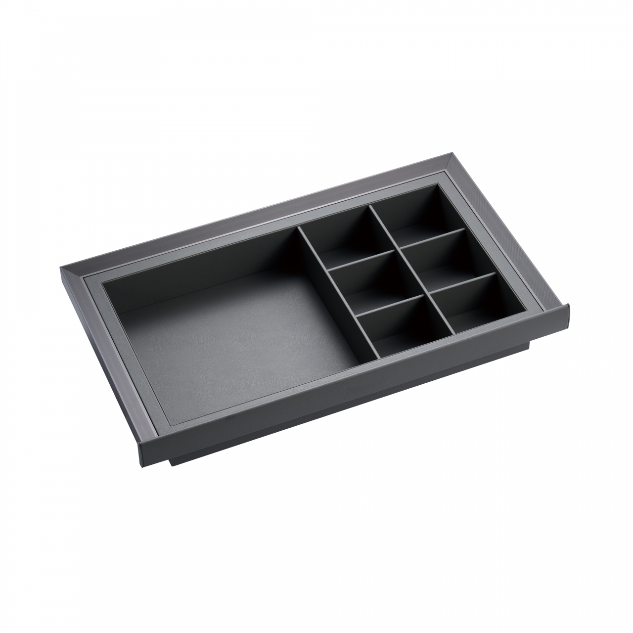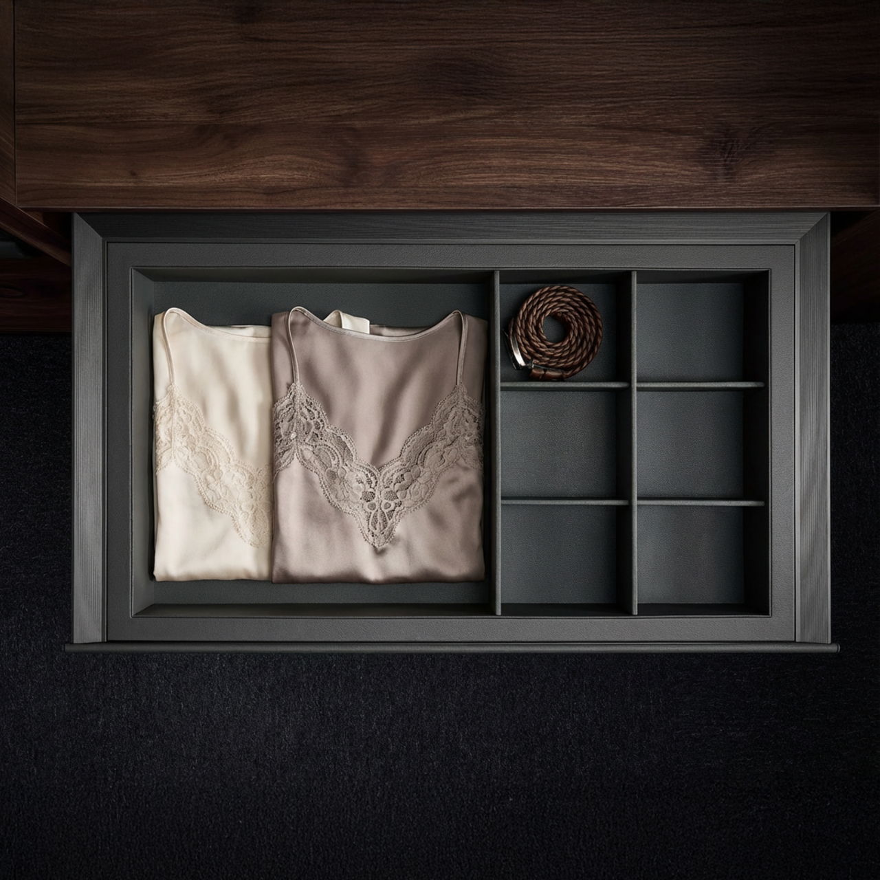 A gaveta organizadora com divisões Klosi para armários de quarto é a escolha ideal para quem procura organização, sofisticação e funcionalidade num único acessório premium. Desenvolvida para integrar na perfeição os armários Klosi, esta gaveta destaca-se pelo seu design moderno e elegante, com linhas retas e estética minimalista. Fabricada com materiais de elevada qualidade, apresenta um requintado acabamento em couro premium, combinado com estrutura metálica na cor antracite, garantindo durabilidade, resistência e um visual contemporâneo. A linha exclusiva Klosi reflete atenção ao detalhe e um elevado padrão de fabrico. Equipada com corrediças com amortecedor, esta gaveta assegura um fecho suave e silencioso, elevando o conforto de utilização diária. A sua instalação é rápida e simples, adaptando-se facilmente ao interior do armário.