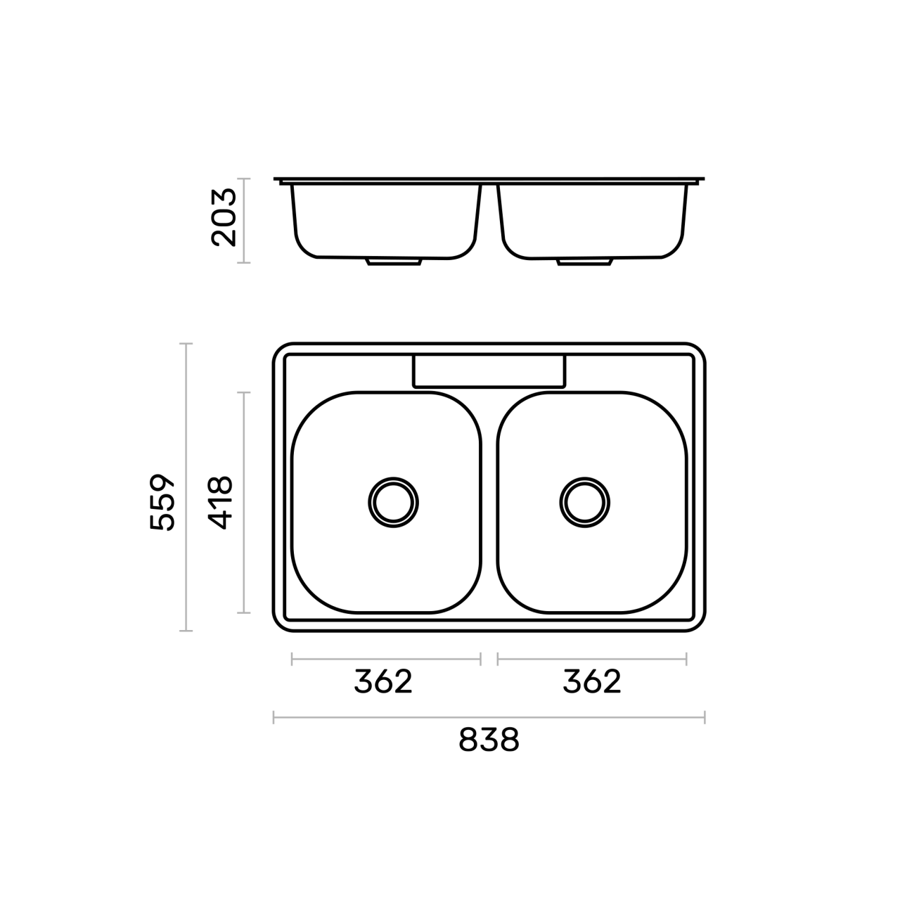 Medida total: 556 (A) x 838 (L) x 203 (P) | Medida da pia: 418 (A) x 362 (L) (x2) | 1 | E14203 |