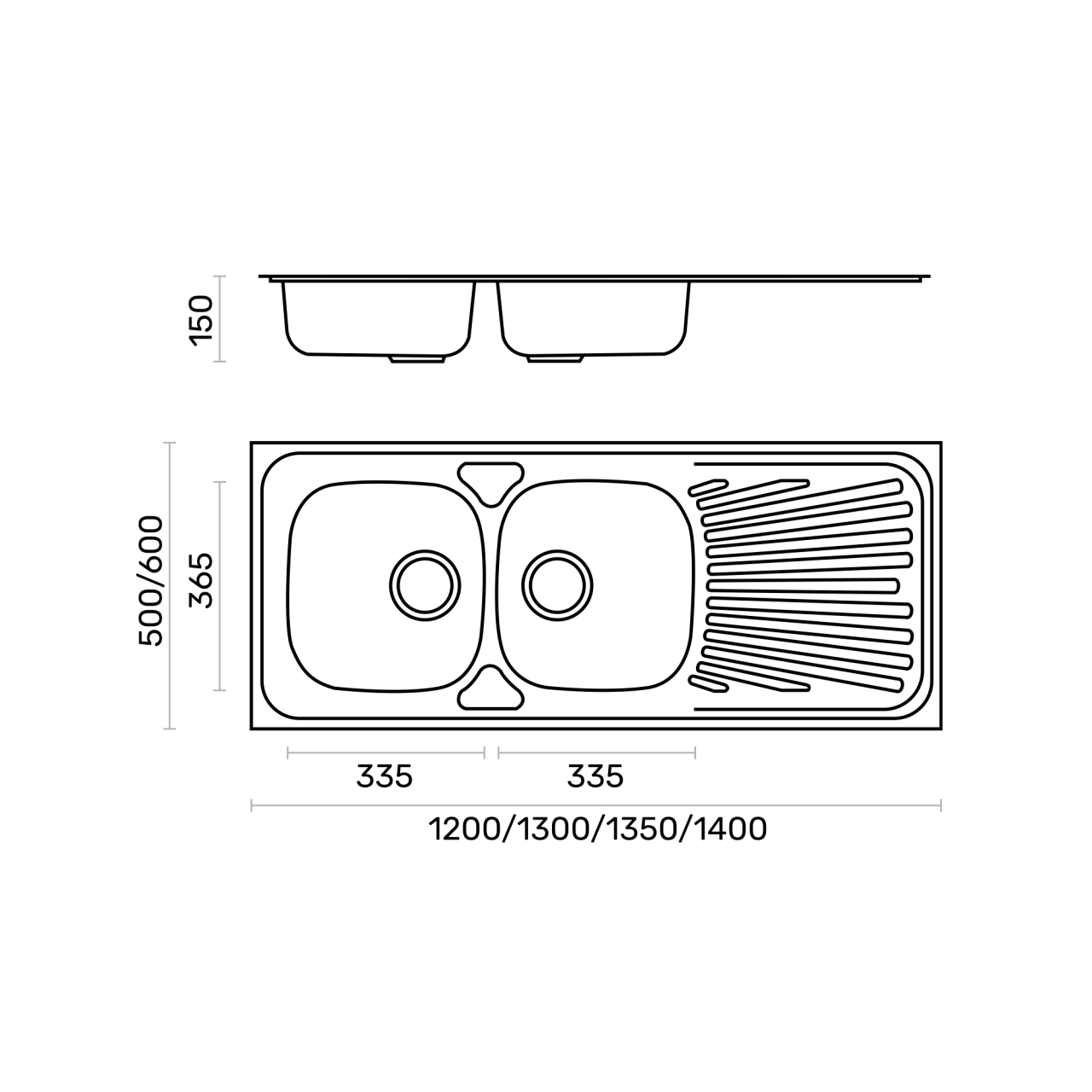 Medida total: 500 (A) x 1350 (L) x 150 (P) | Medida da pia: 365 (A) x 335 (L) (x2) | 1 | N3135NP |