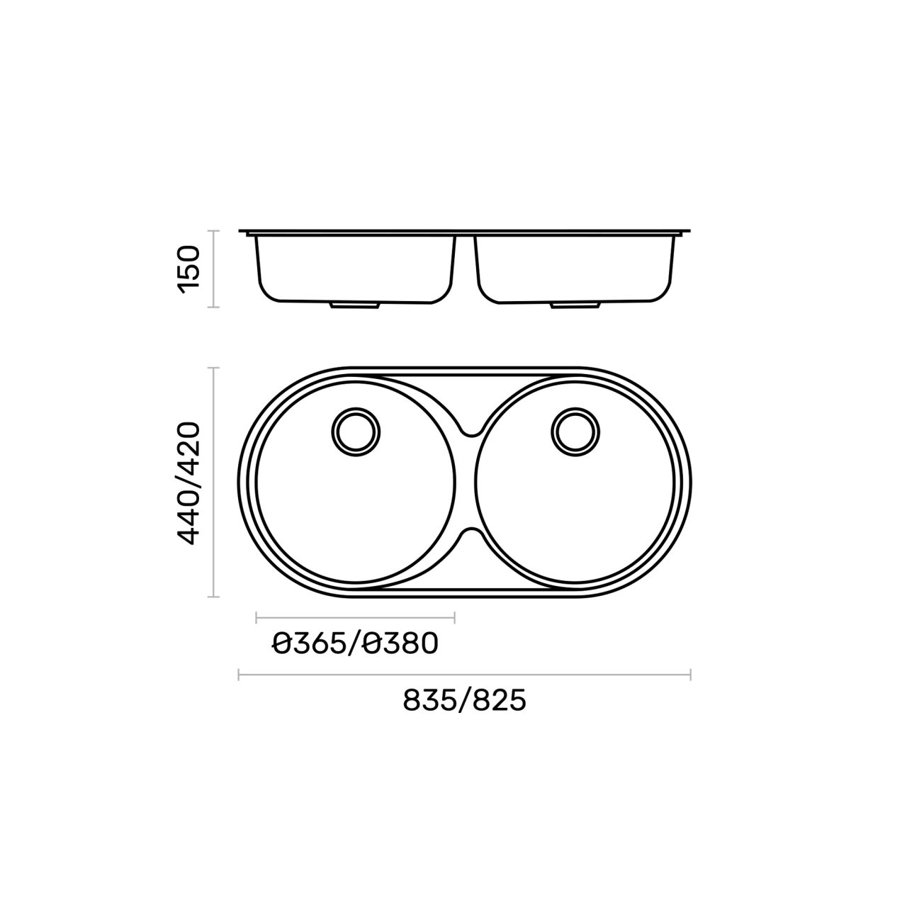 Medida total: 440/420 (A) x 835/825 (L) x 150 (P) | Medida da pia: Ø380 | 1 | U6045 |