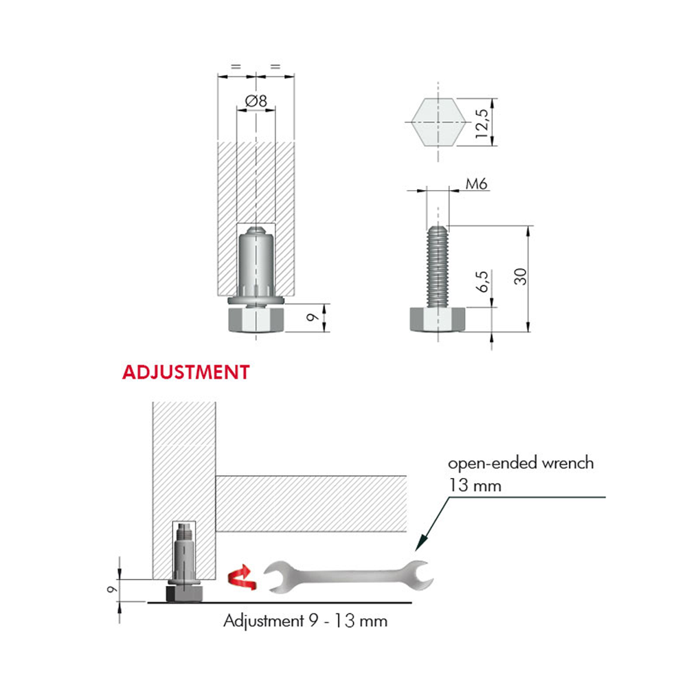 O nivelador de pé M6xH30 pré-montado é uma solução versátil e prática para nivelamento de móveis, concebido para permitir ajustes rápidos e precisos em diferentes aplicações de mobiliário. Equipado com rosca M6 e altura de 30 mm, este nivelador regula a altura do móvel de forma simples, garantindo estabilidade e alinhamento mesmo em pavimentos irregulares.