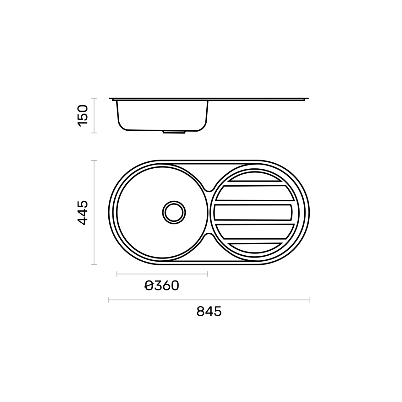 Medida total: 445 (A) x 845 (L) x 150 (P) | Medida da pia: Ø360 | 1 | E7045 |