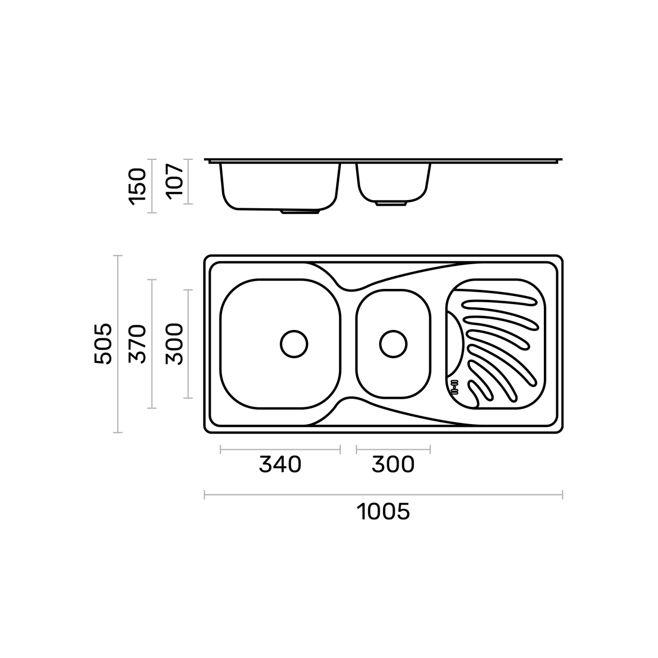 Medida total: 505 (A) x 1005 (L) x 150/107 (P) | Medida da pia: 370/300 (A) x 340/300 (L) | 1 | E18002 |