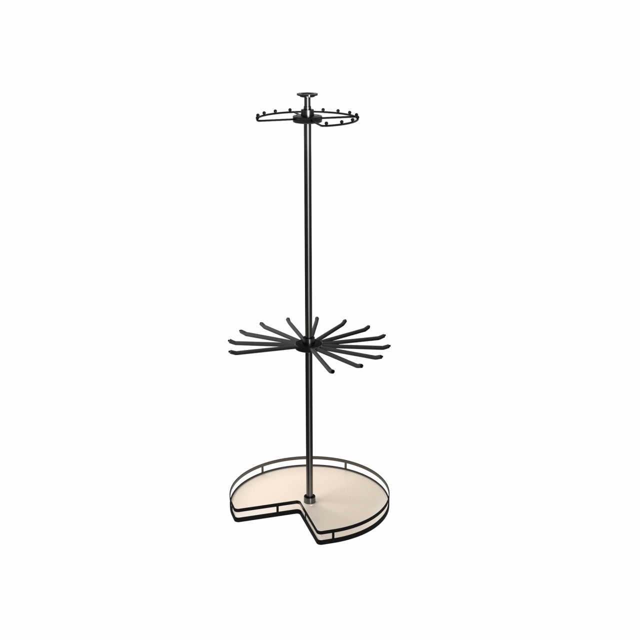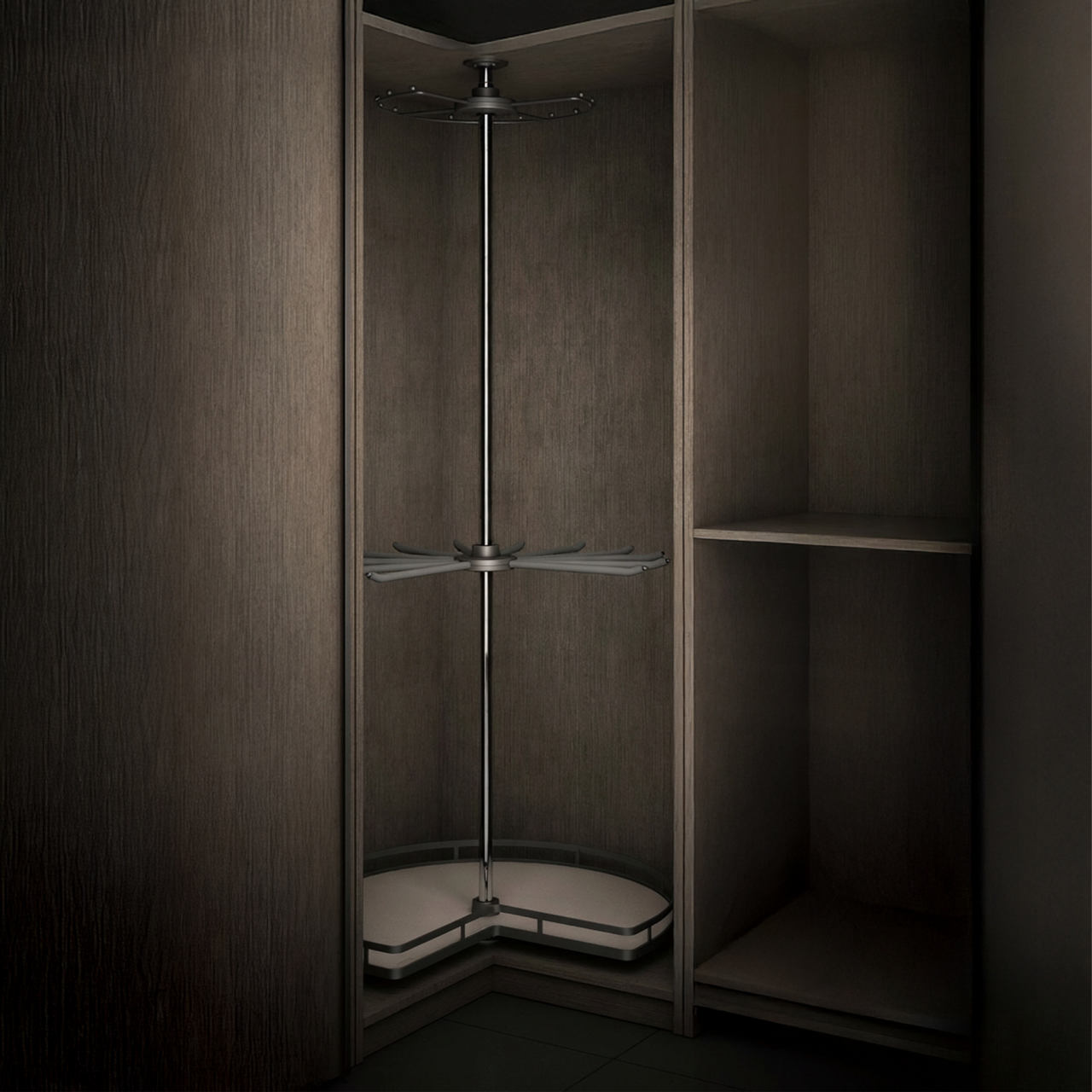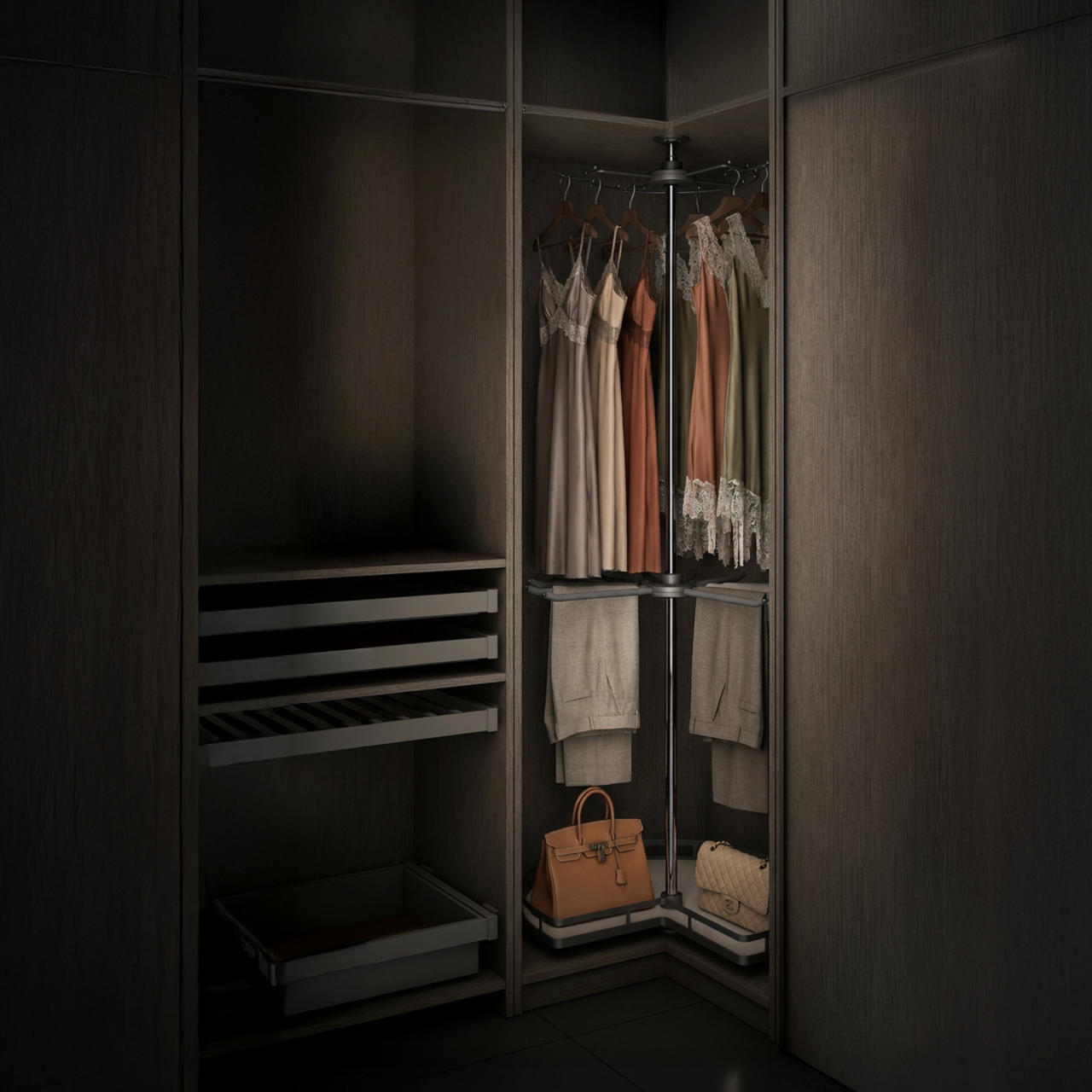 O Organizador de Canto Klosi com 3 camadas para armários ou closet é uma solução criada para maximizar o espaço interior com elegância e funcionalidade. O seu sistema de rotação 360° permite acesso total aos itens armazenados, tornando a organização diária mais prática e eficiente. Este organizador integra um design moderno, característico da gama premium Klosi, e adapta-se de forma harmoniosa a armários e closets. A sua estrutura metálica na cor antracite combinada com acabamento em couro oferece resistência, durabilidade e um aspeto sofisticado.