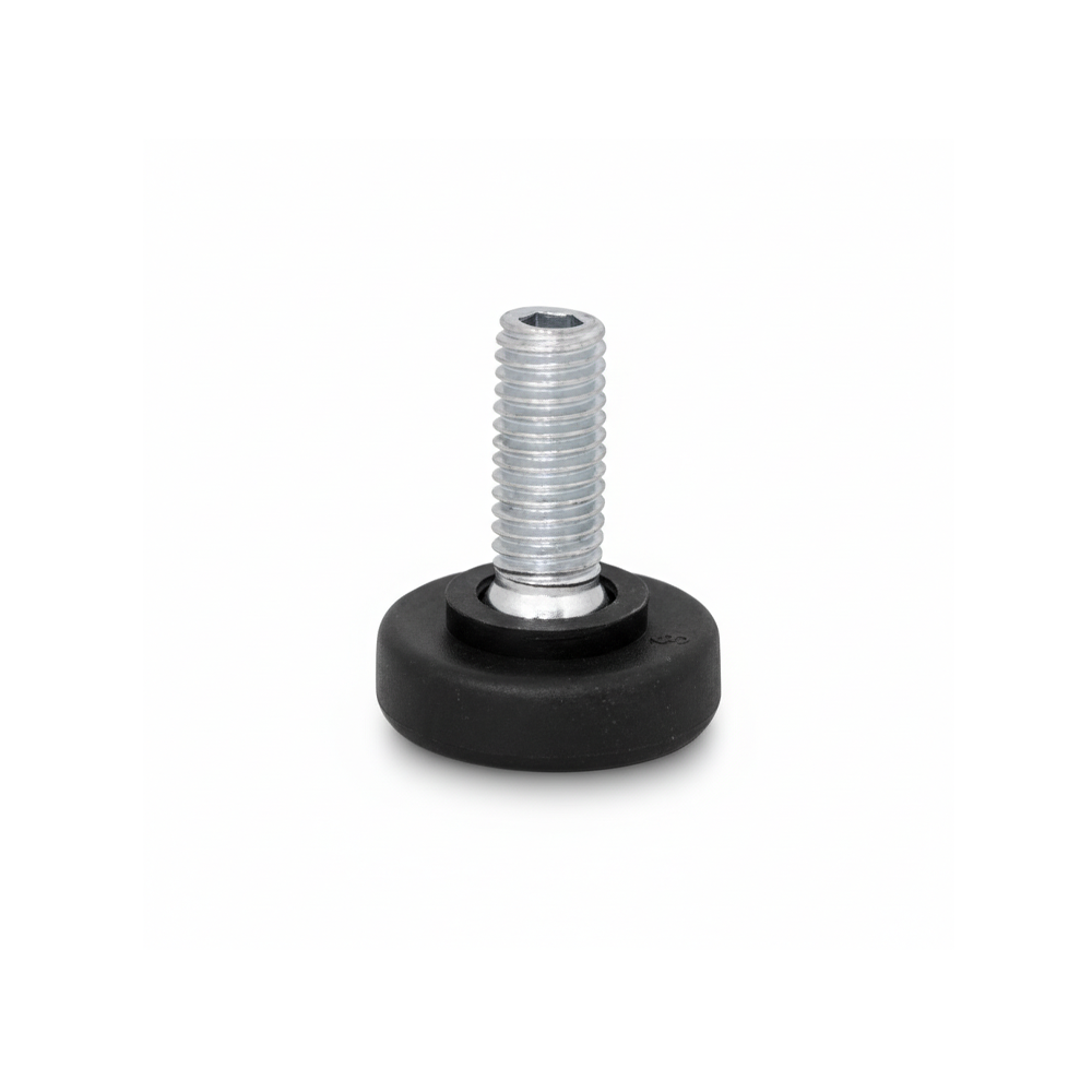 Este nivelador é composto por uma base de plástico preto resistente e um parafuso metálico em ferro com rosca M8, garantindo durabilidade e capacidade de suporte em aplicações domésticas ou profissionais. O sistema de ajuste com chave Allen permite regulação fácil e segura, assegurando um alinhamento preciso do móvel sem necessidade de desmontagem.