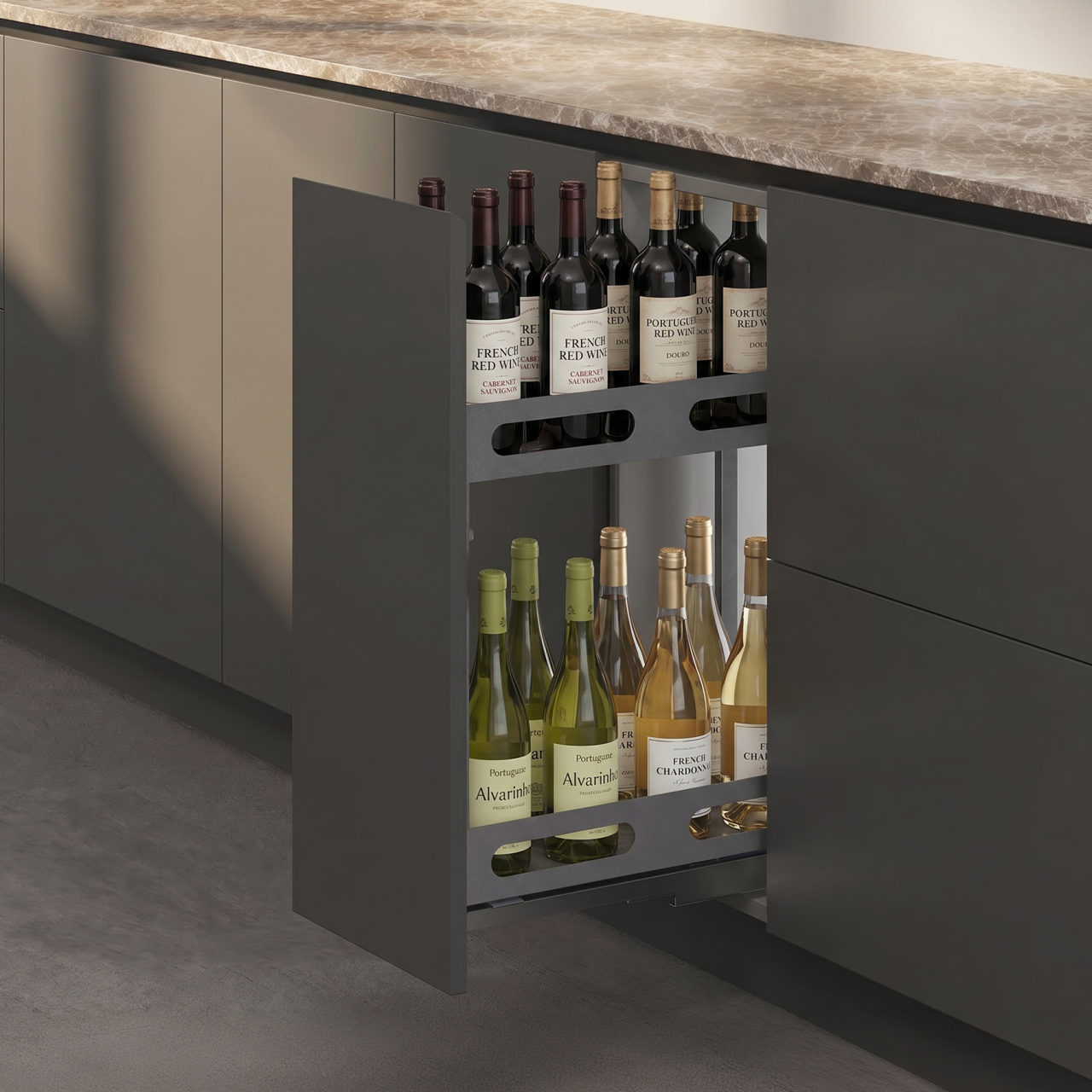 Com acabamento em cor antracite e design moderno, integra-se perfeitamente em cozinhas contemporâneas, proporcionando organização e elegância ao interior do móvel.