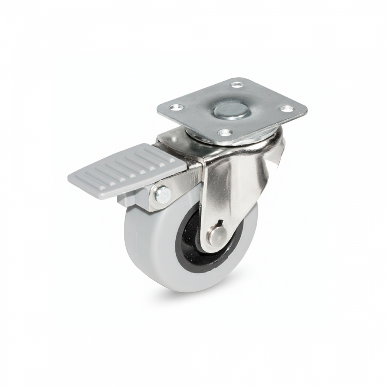 A versão com travão integrado oferece bloqueio tanto da rotação da roda como da cabeça giratória, garantindo que o equipamento ou móvel onde foi instalado permaneça parado quando necessário, evitando deslocações acidentais e assegurando segurança durante operações ou repouso.