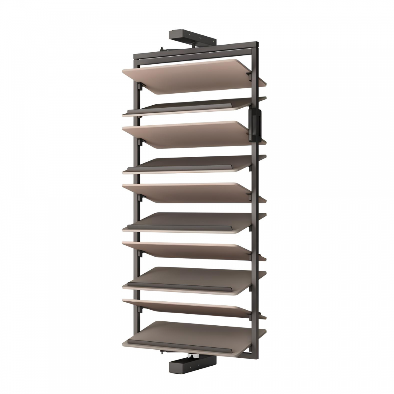 A Sapateira 360° Klosi para armários ou closet é uma solução desenvolvida para oferecer organização eficiente com elegância. O seu design inovador permite acesso aos sapatos a partir de qualquer direção, facilitando a visualização e a escolha diária dos calçados. Integrada na linha exclusiva Klosi, esta sapateira apresenta um design moderno. Sua estrutura metálica na cor antracite, aliada ao acabamento em couro de elevada qualidade, confere resistência, durabilidade e um visual sofisticado. A sapateira 360° Klosi valoriza o espaço interior, que permite distribuir até 30 pares de sapatos em 10 prateleiras distintas. Este acessório reflete o padrão de qualidade e requinte característico da marca Klosi, uma linha exclusiva Febol.