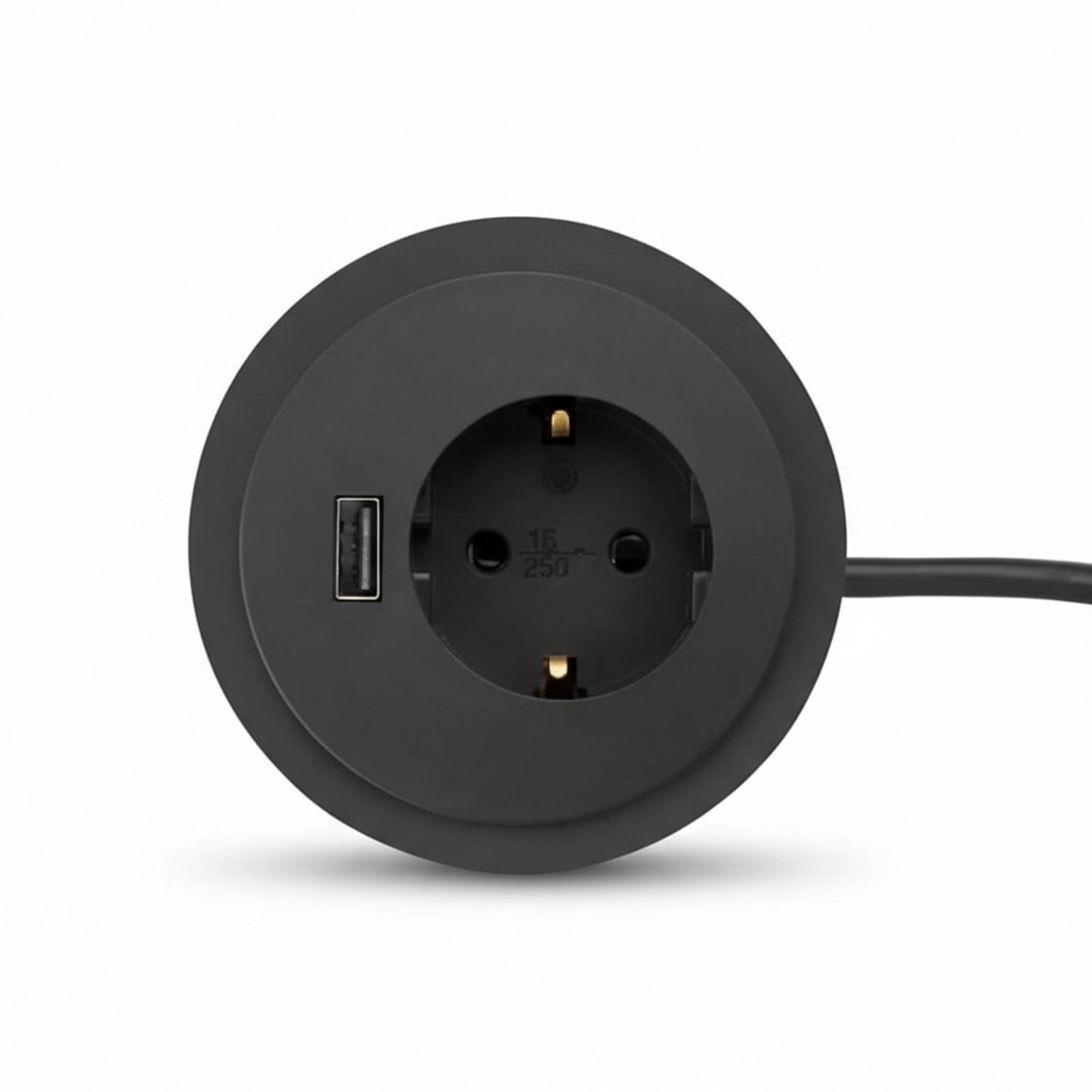 As versões disponíveis incluem: 1 plug UE + passa-cabos para passagem ordenada de fios + 1 plug UE + 1 porta USB que permite carregar dispositivos móveis e periféricos diretamente a partir da mesa ou bancada. Estas soluções são ideais para ambientes de trabalho, escritórios, cozinhas ou quartos onde se pretende acesso fácil à energia e carregamento de dispositivos sem comprometer a estética da superfície de utilização.
