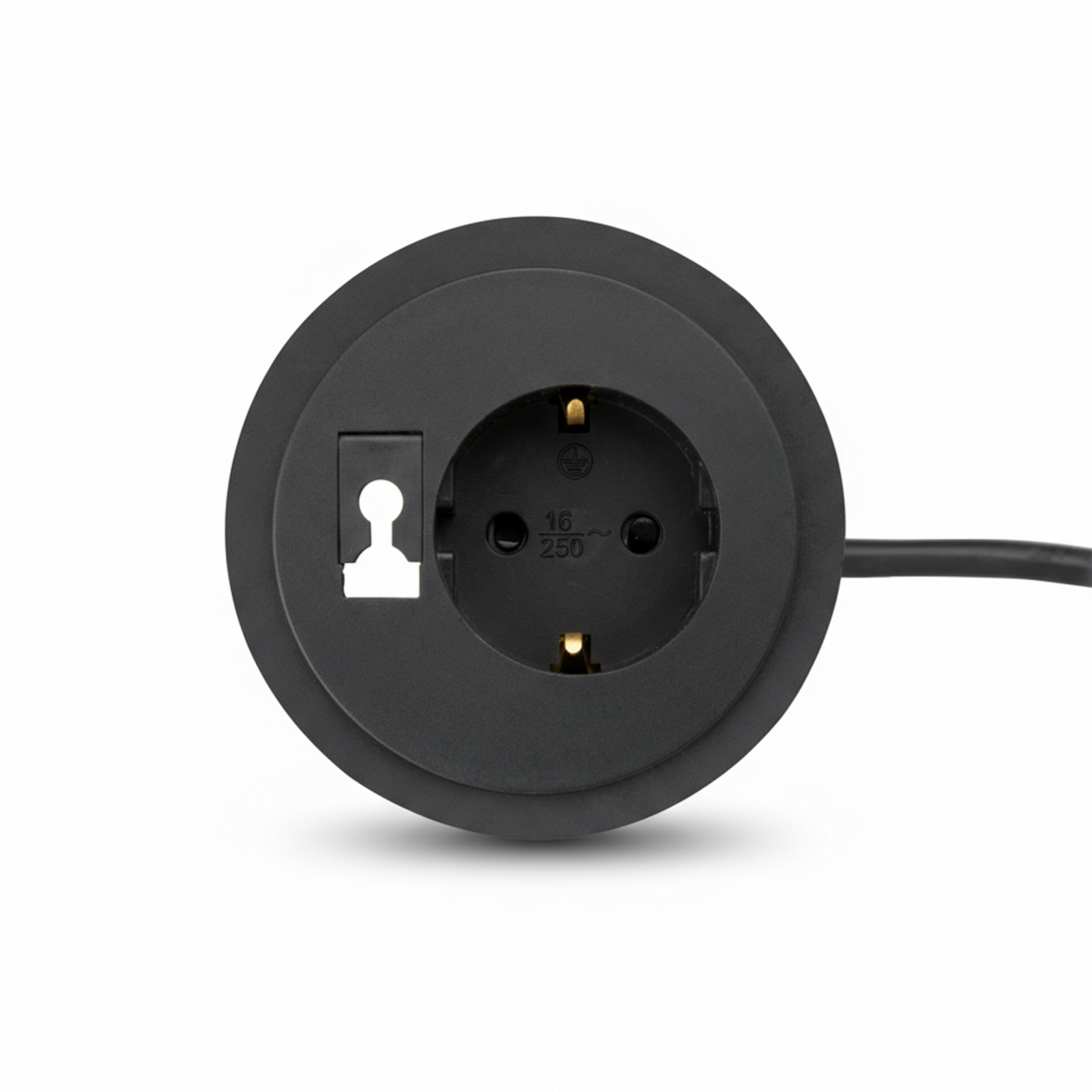 As tomadas SPOT são um sistema elétrico compacto e discreto especialmente concebido para embutir facilmente em mesas, secretárias ou bancadas com um furo padrão de Ø60 mm, oferecendo uma solução integrada e organizada para acesso à energia. Com um cabo de aproximadamente 1,5 m, estas tomadas podem ser ligadas diretamente à rede elétrica sem necessidade de encomendar um cabo de ligação separado, proporcionando uma instalação rápida e prática.
