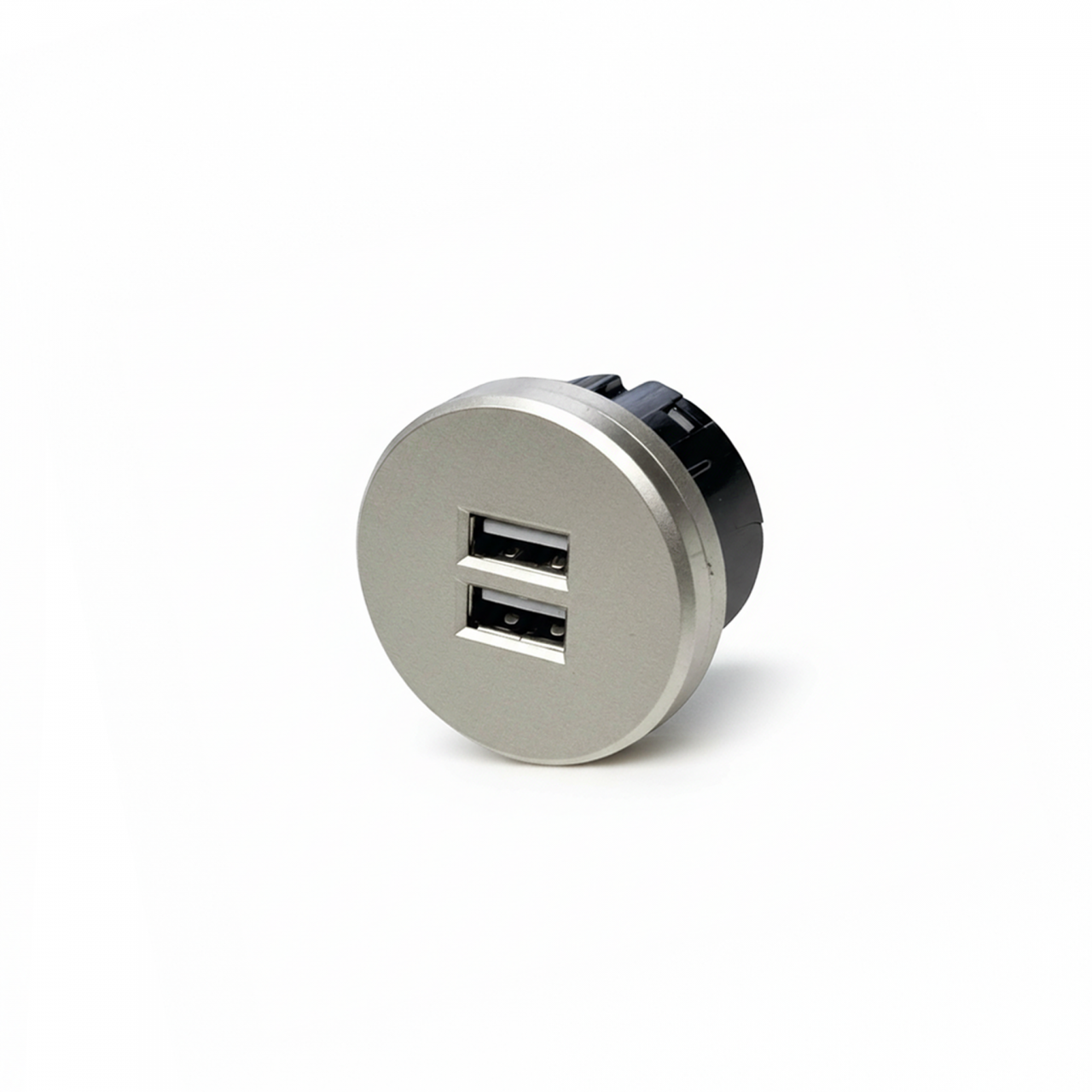 A tomada DOCK é um módulo redondo de embutir em móveis e revestimentos concebido para fornecer duas saídas USB para carregamento simultâneo de dispositivos como telemóveis, tablets e outros equipamentos USB, sem necessidade de adaptadores externos. Este dispositivo compacto é ideal para mesas, secretárias, bancadas de cozinha ou áreas de trabalho, mantendo um visual limpo e funcional que se integra facilmente no mobiliário.