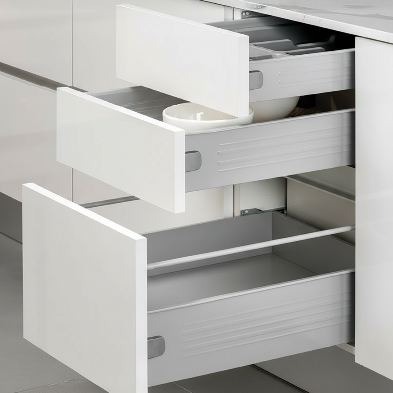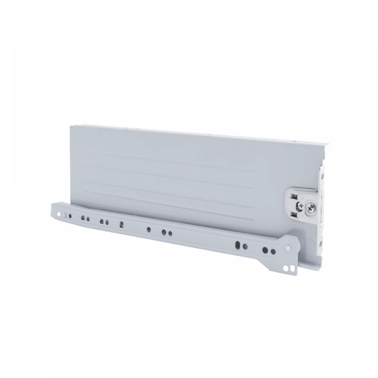 O kit de gaveta Ultrabox para cozinha e casa de banho é constituído por ilhargas de gaveta em aço com corrediças de rodízios, apresentando um moderno acabamento cinza ou branco. Este sistema de gavetas oferece uma solução prática, resistente e funcional para mobiliário de cozinha e de banho. Cada kit inclui todos os componentes essenciais para a montagem completa da gaveta, incluindo as ilhargas laterais, o conjunto de corrediças de rodízios de descida e os engates frontais para fixação do frente da gaveta. Para concluir a instalação, basta acrescentar os painéis ou aglomerados cortados à medida correta para o fundo, a traseira e a frente da gaveta.